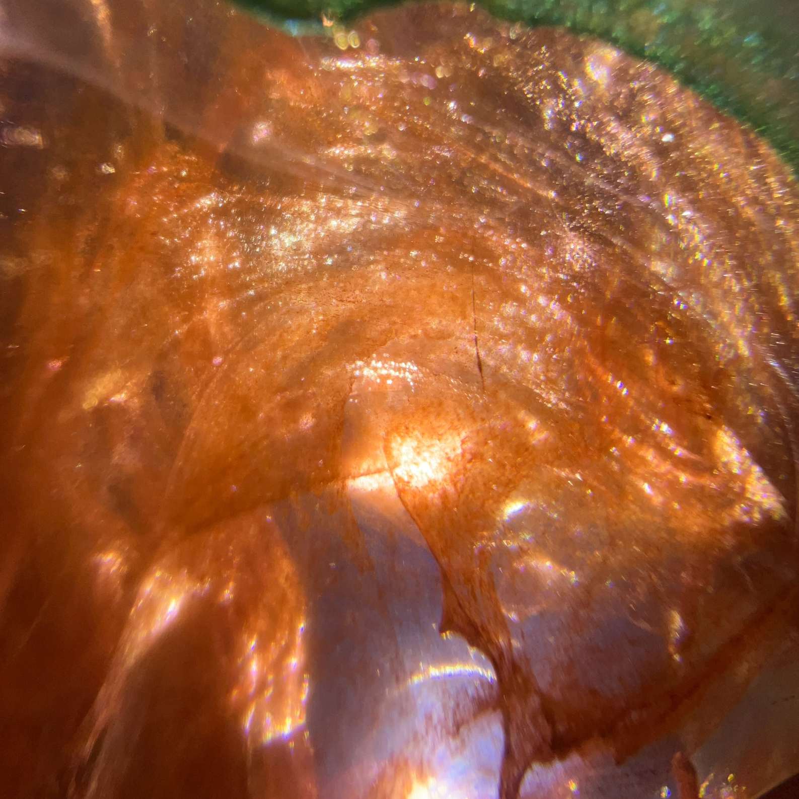 This warm and shiny swirl looks like the heat of a sun. The copper bits inside look like hot metal and solar flames. it is a solid piece that brings a cozy feeling into your home.
